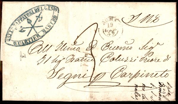 1849 - Repubblica Romana - Batt. Zappatori del Genio - Quartier Mastro (Ovale verde) ripetuto verso-recto - Lettera in franchigia per Carpineto del 19.1.49