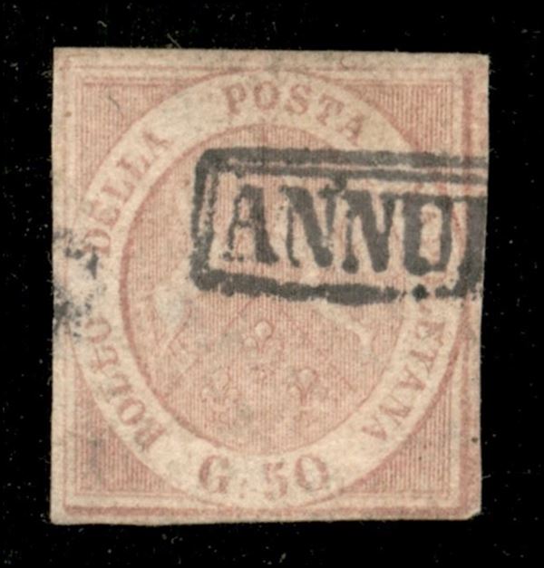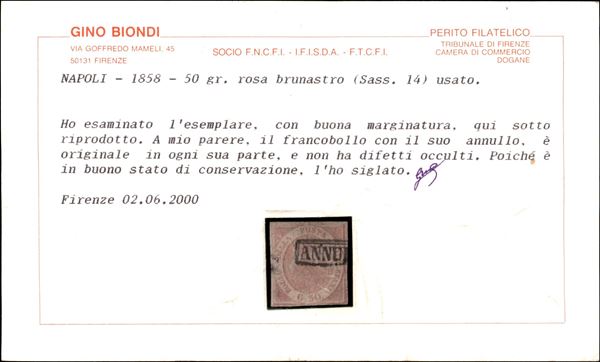 1858 - 50 grana rosa brunastro (14) - usato - cert. Biondi