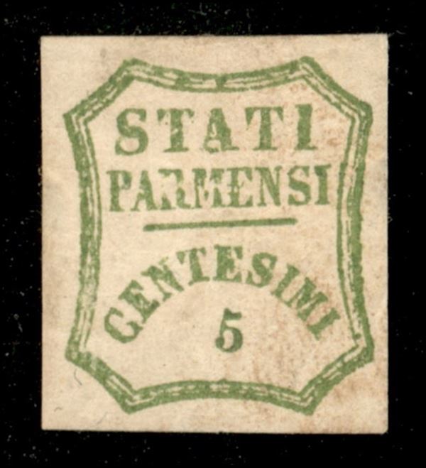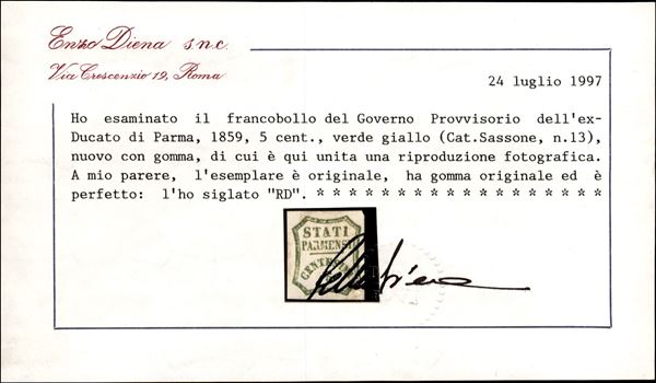 1859 - 5 cent verde giallo (13) - gomma originale con linguella - cert. Diena