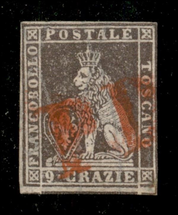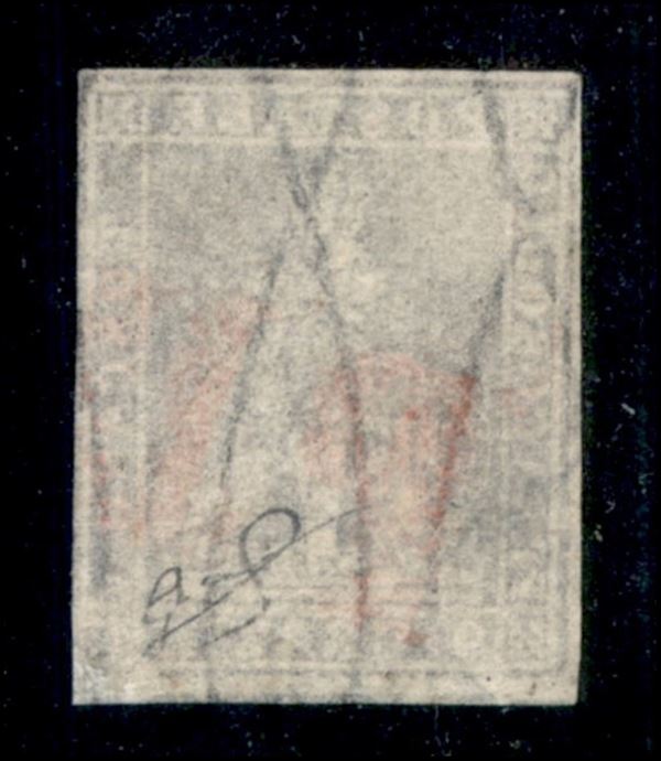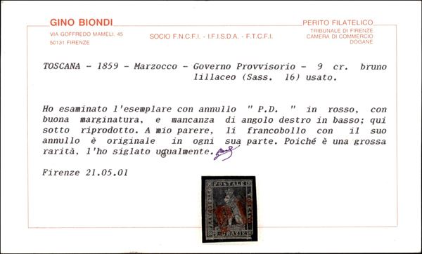 1859 - 9 crazie bruno lillaceo (16) annullato con PD rosso - riparato - cert. Biondi