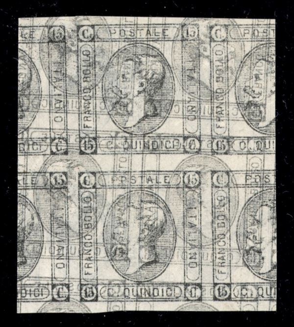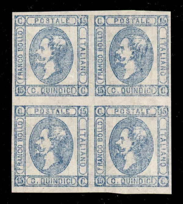 1863 - Resti di Stampa - 15 cent Litografico (12 - celeste chiaro) in quartina - doppia stampa in nero e grigio (dritta + decalco) al retro - sempre senza gomma (2600+)
