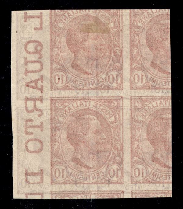 1906 - 10 cent Leoni (82eab varietà t) - quartina non dentellata con doppia stampa (spostata con intere diciture marginali) + doppio decalco - gomma originale - non catalogata