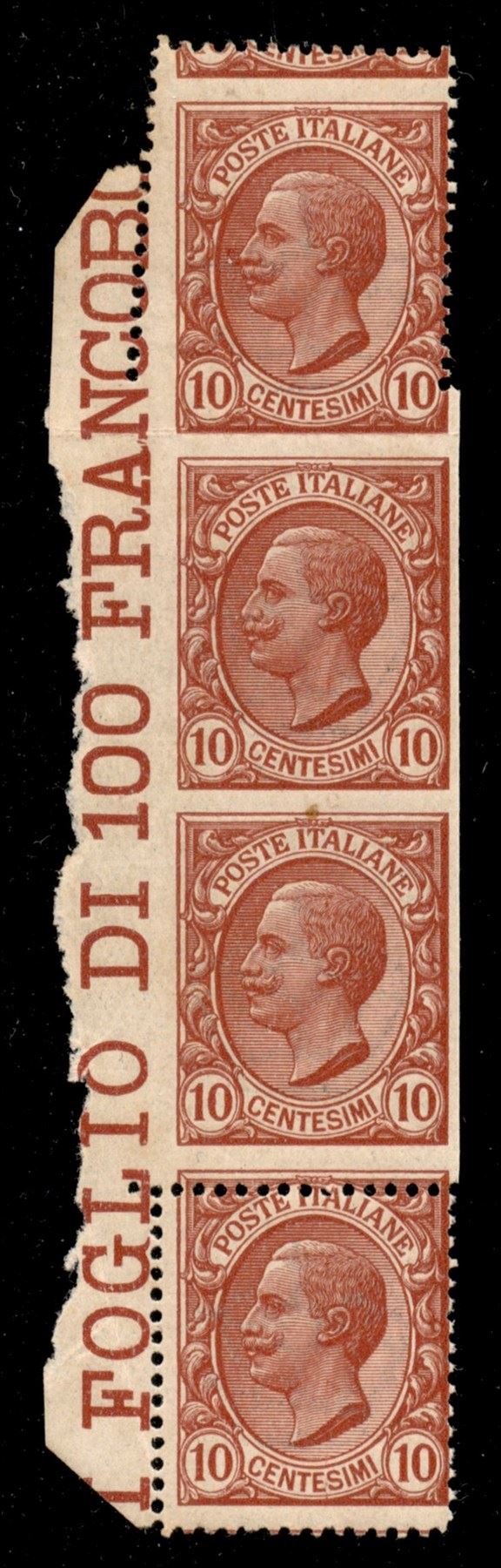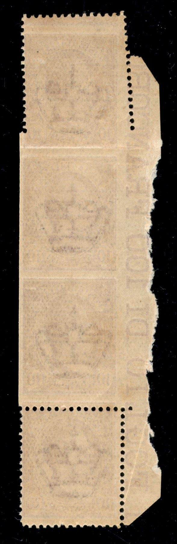 1906 - Striscia di quattro del 10 cent (82mba varietà) dentellata negli esemplari superiore e inferiore e non dentellata nei due esemplari centrali - gomma integra - raro - cert AG (4500++)