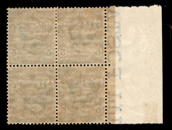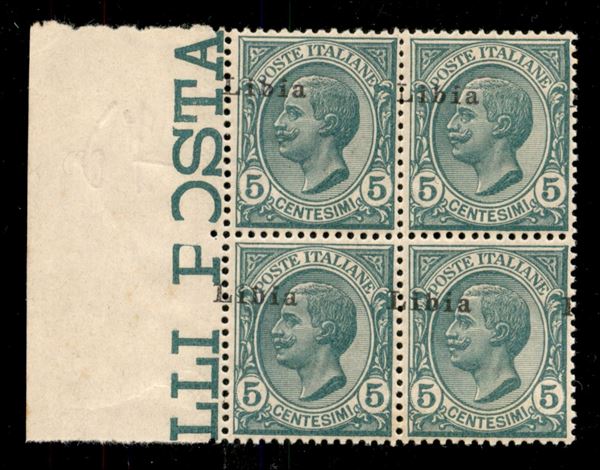 1912 - 5 cent Leoni (3d varietà la) - quartina bordo foglio con soprastampe oblique in alto a sinistra con L a cavallo e sul bordo - gomma integra - ottimamente centrato - non catalogato