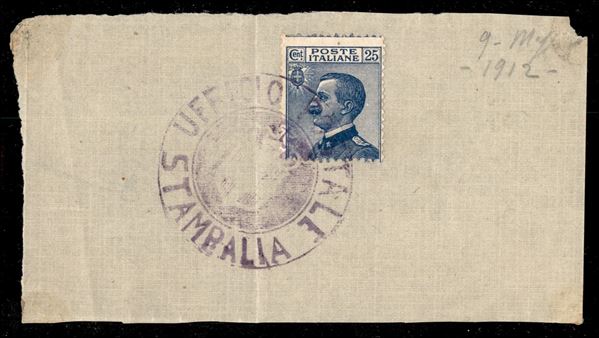 1912 - Ufficio Postale Stampalia - 25 cent (83 - Regno) applicato su piccolo frammento di carta