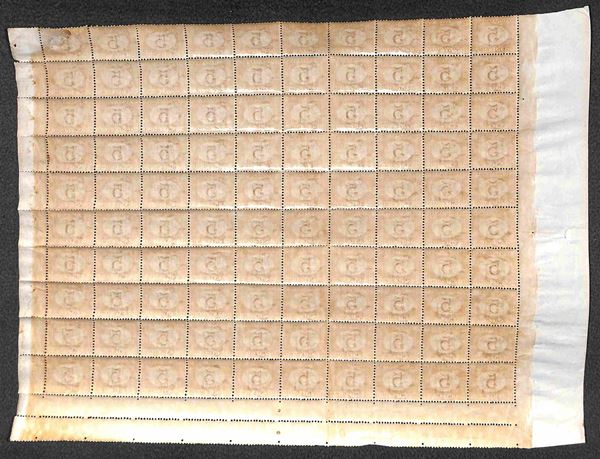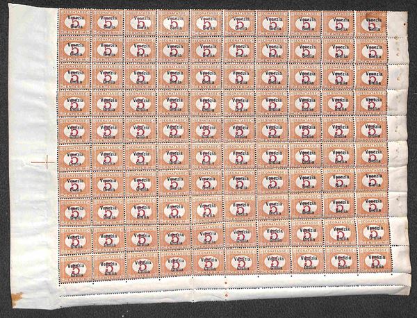 1918 - Intero foglio completo di tre margini del 5 cent (1) con a di Giulia di carattere diverso - gomma integra