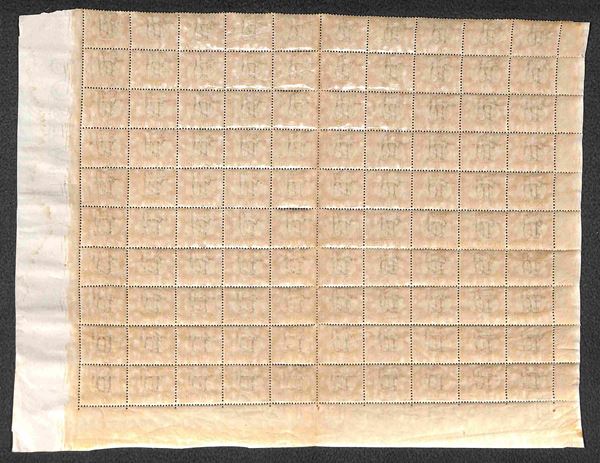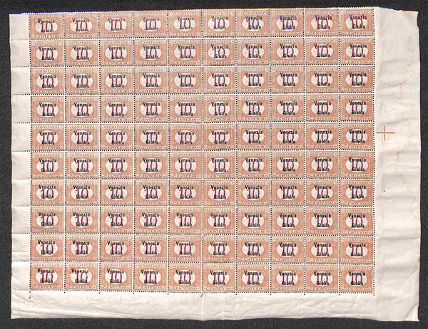 1918 - Intero foglio completo di tre margini del 10 cent (2) con a di Giulia di carattere diverso - gomma integra - valore pos. 92 con aderenze di carta sul fronte