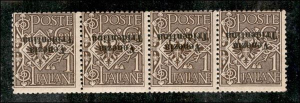 1918 - Striscia di quattro del 1 cent (19aa) con soprastampa capovolta pił u capovolta al posto di n di Tridentina - gomma integra