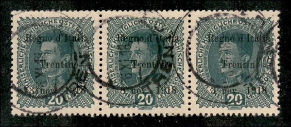 1918 - Striscia di tre del 20 heller (7d) con 8 nov. invece di 3 nov. - usato - E. Diena
