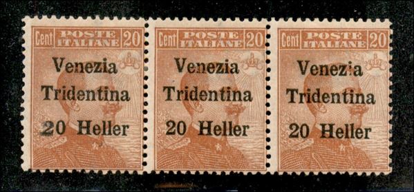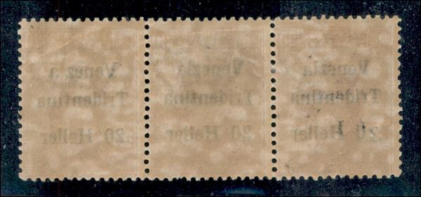 1918 - Striscia di tre del 20 heller su 20 cent (30e + 30) con 2 stampigliato a mano - gomma integra (linguella sull'esemplare centrale)