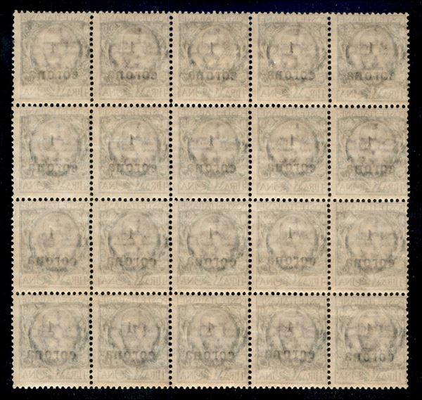 1919 - Blocco di 20 del 1 corona su 1 lira (11) con alcuni difetti di composizione - gomma integra