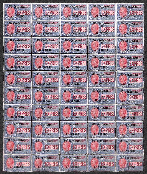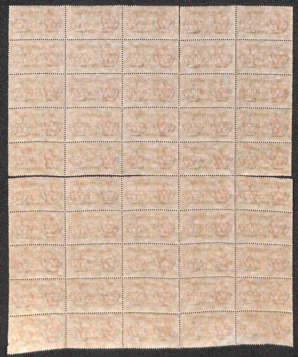 1919 - Blocco di 50 del 30 cent su 30 cent (2) con diversi esemplari con u capovolta al posto della n di centesimi - gomma integra