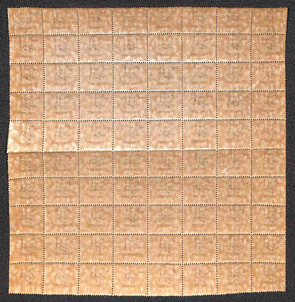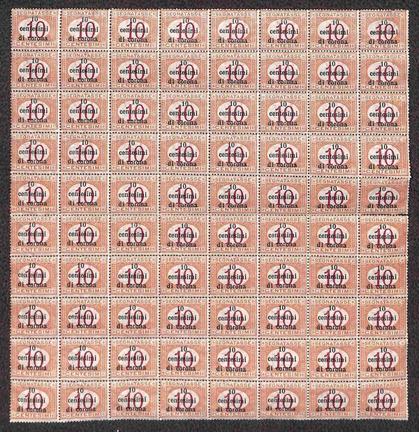 1919 - Blocco di ottanta del 10 cent su 10 cent (2) - notati diversi disallineamenti delle cifre - gomma integra