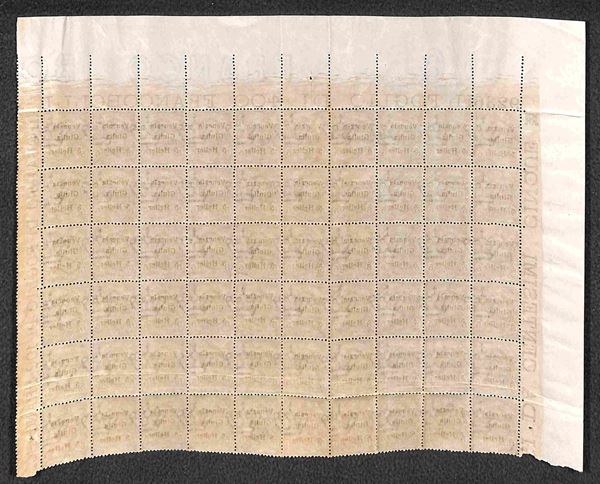 1919 - Blocco di sessanta completo di margini del 5 heller su 5 cent (30) con varietà cb N capovolta al posto di u - gomma integra
