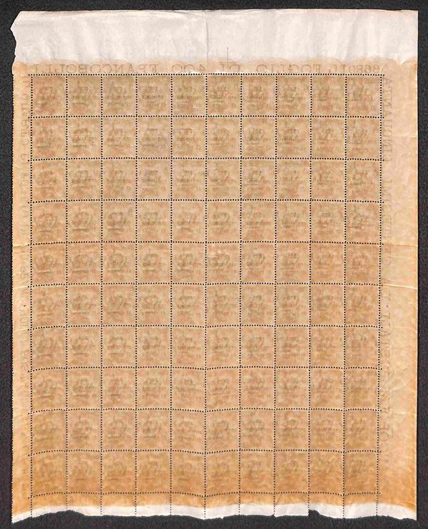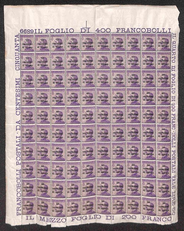 1919 - Intero foglio completo di margini e numero di Tavola del 50 cent su 50 (9) con diversi errori di composizione - gomma integra