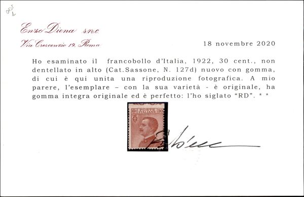 1922 - 30 cent Michetti (127d) non dentellato in alto - bordo foglio - gomma integra - cert. Diena