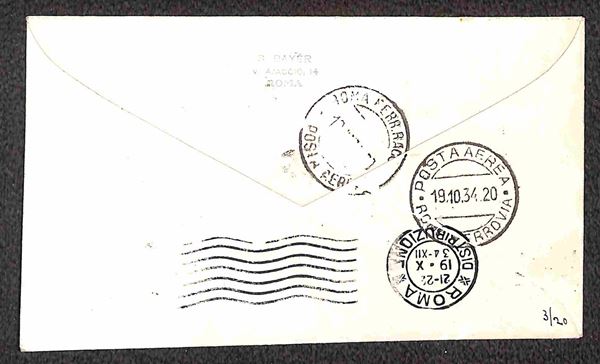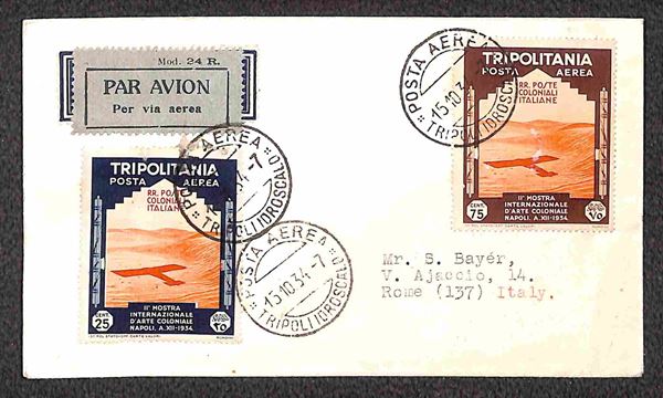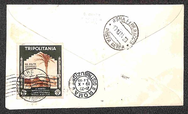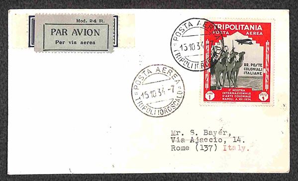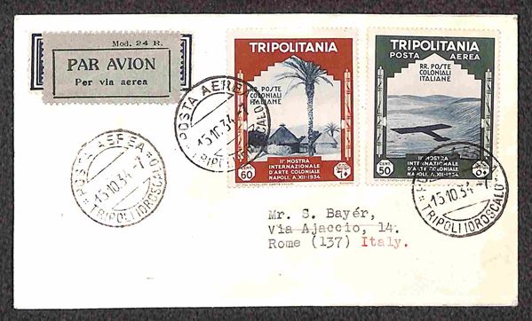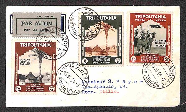 1934 (15 ottobre) - quattro aerogrammi Bayer da Tripoli a Roma affrancati con valori di Tripolitania della Mostra Arte Coloniale annullati il giorno precedente la data ufficiale di emissione - 20 volati - raro insieme