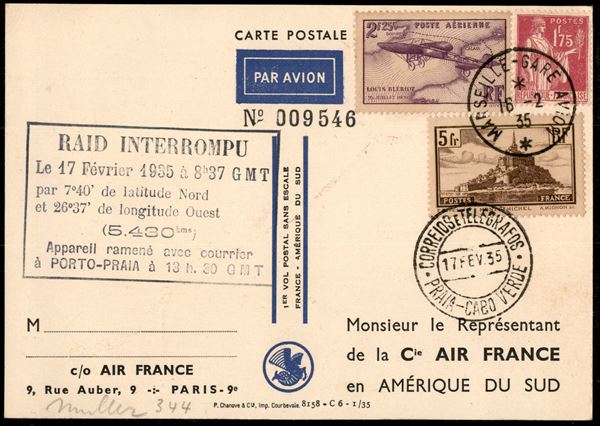 1935 - Crash Flight - Cartolina del Primo volo diretto Francia America del Sud del 16.2.35 interrotto a Porto Praia (Capo Verde) il 17.2 - ben conservata