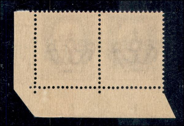 1943 - 50 cent (477/Ihcb errore pd + 477/Ihcb) - coppia angolare (pos. 199/200) con R a cavallo ripetuto a margine + punto piccolo dopo N a sinistra - gomma integra - Sorani