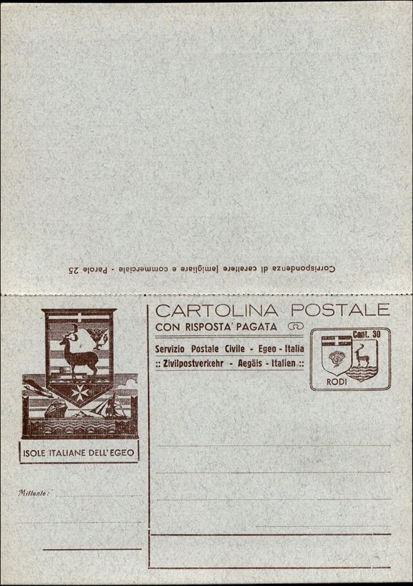 1943 - Cartolina Postale da 30 cent + 30 cent (C2) con risposta pagata - nuova