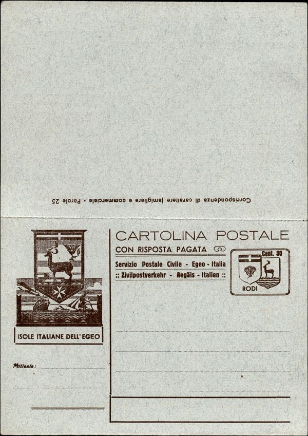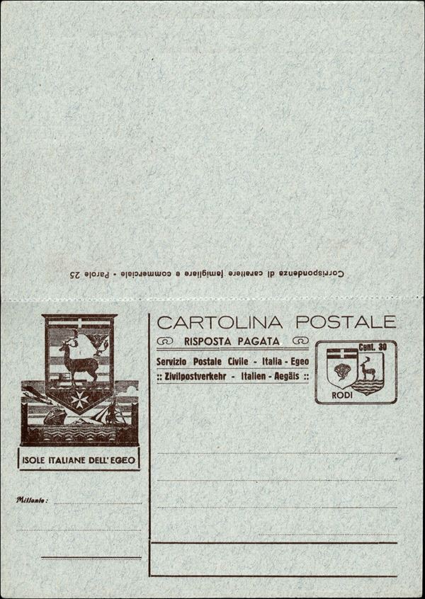1943 - Cartolina Postale da 30 cent + 30 cent (C3) con risposta pagata tra due fregi - nuova
