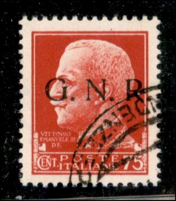 1943 - GNR - soprastampa di Brescia - Seconda Tiratura (800 pezzi) - 75 cent (478/I) usato con annullamento garantito originale - estremamente raro - cert. AG
