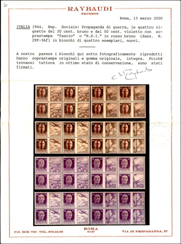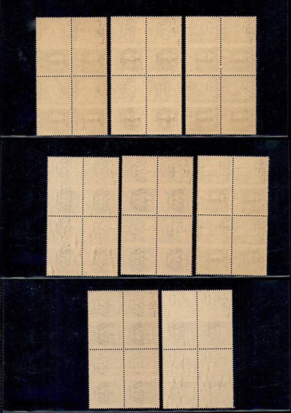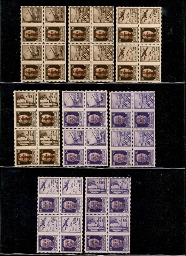 1944 - Soprastampa rosso bruna (29D/36D) - 8 valori in quartine - gomma integra - cert. Raybaudi