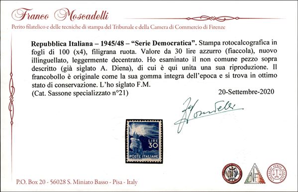 1947 - 30 lire Democratica (563) - gomma integra - Oliva + cert Moscadelli