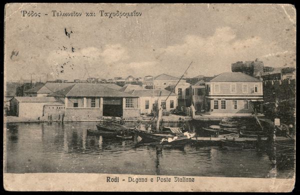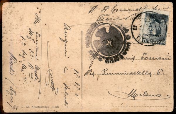 20 cent su 15 (8 varietà) con soprastampa sotto Cent. 15 (non catalogato) - cartolina da Rodi (Dogane e Poste) per Milano del 19.4.17