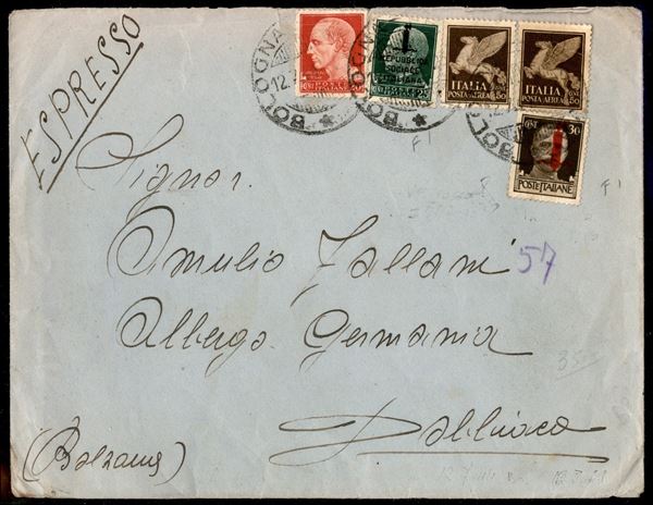 25 cent (491) + 30 cent (492/II) + complementari (247 + due 11 Aerea) - espresso da Bologna a Dobbiaco del 12.3.44