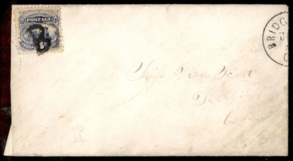 3 cent (28) annullato con "B" stampatello su bustina da Bridgeston - busta rifilata sulla sinistra