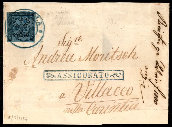 40 cent celeste (5) isolato su gran parte di assicurata (fronte + parte del retro) da Guastalla a Villach del 6.3.1854 - tre grandi margini e perfetto in alto a sinistra - raro insieme - Em. Diena