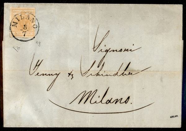 5 cent giallo arancio (1g) isolato su lettera per cittą - Milano 8.7.1853