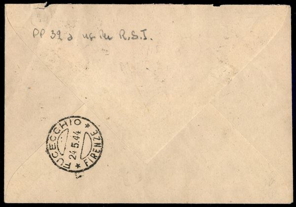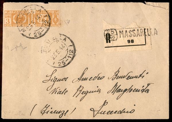 Affrancatura d'emergenza - 3 lire Pacchi Postali (32) su raccomandata da Massarella a Fucecchio del 23.5.44 - Chiavarello