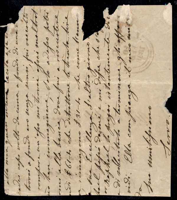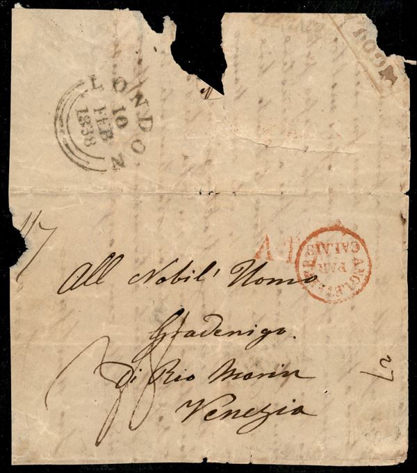 Angleterre par Calais (in rosso) - fronte di lettera (con parte del retro) da Londra a Venezia del 10.2.1838