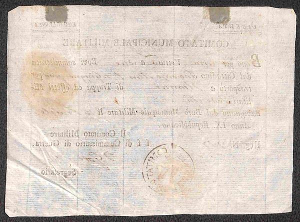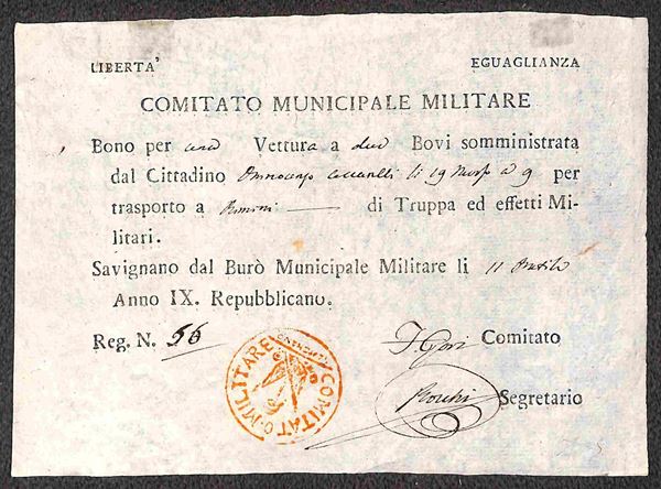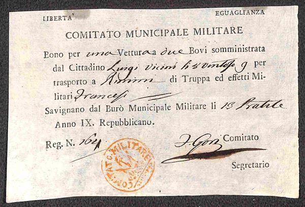Anno IX - Savignano - Comitato Municipale Militare - quattro buoni per Vettura e due Bovi