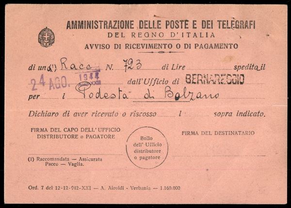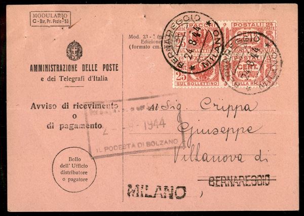 Avviso di Ricevimento (Mod. 23) affrancato con coppia del 25 cent Pacchi Postali (26) da Bernareggio a Bolzano del 24.8.44