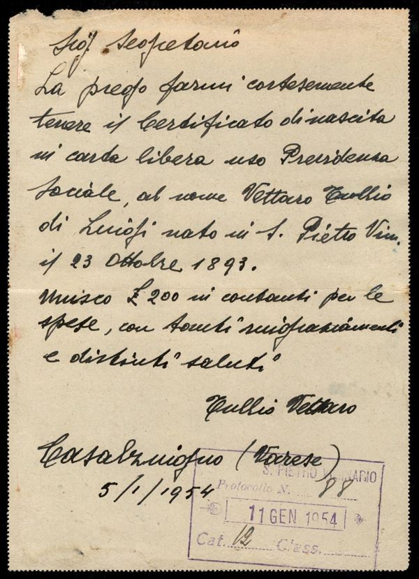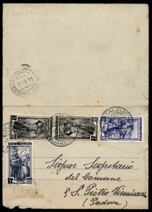 Biglietto postale da 50 cent (B36a) ricoperto da quattro valori dell'Italia al Lavoro (635 + 636 due + 642) da Casalzuigno a S. Pietro Viminario del 7.11.54 - raro uso tardivo ben oltre il 1945 - molto bello