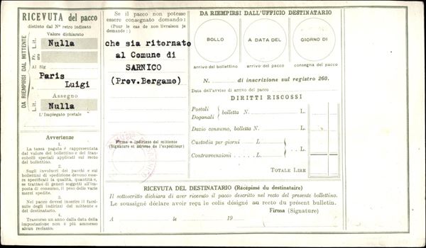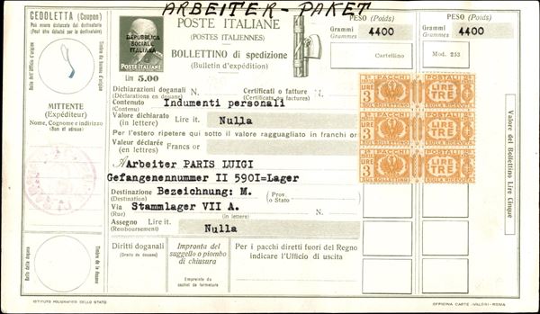 Bollettino di Spedizione ARBEITER-PAKET da 5 lire (P86) affrancato con tre 3 lire Pacchi Postali (32) non spedito per eventi bellici