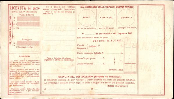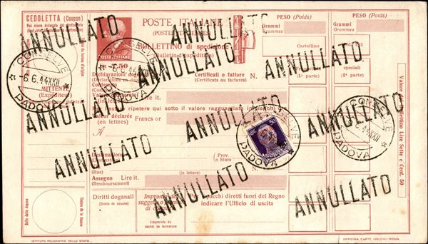 Bollettino Pacchi da 7,50 lire (P66) + 50 cent (493) usato come riepilogo giornaliero - Conselve 6.6.44
