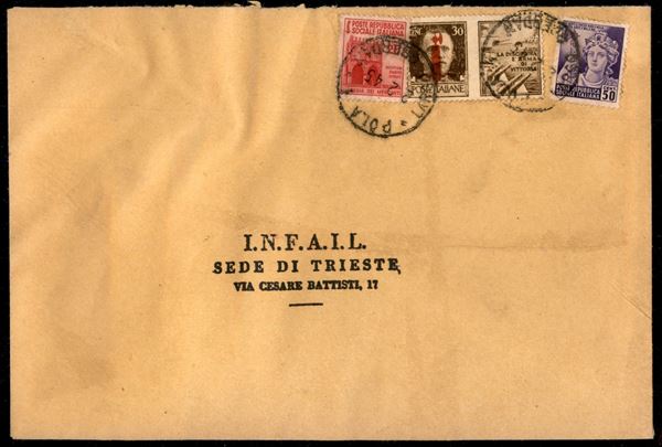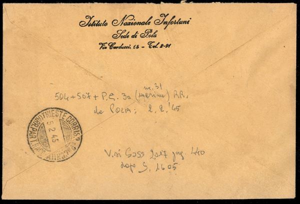 Busta affrancata con 30 cent Propaganda di Guerra (31) + complementari (504 + 507) da Pola a Trieste del 2.2.45