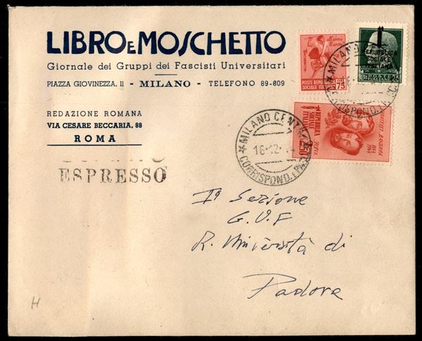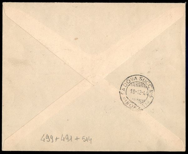 Busta espresso affrancata con 25 cent (491) + Monumenti e Bandiera (499 + 514) da Milano a Padova del 16.12.44
