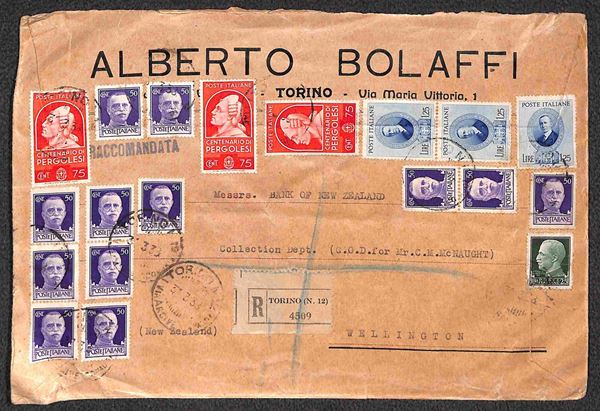 Bustone raccomandato da Torino a Wellington (Nuova Zelanda) del 31.3.38 con affrancatura multipla per 12,25 lire (248 + dodici 251 + tre 431 + tre 438)