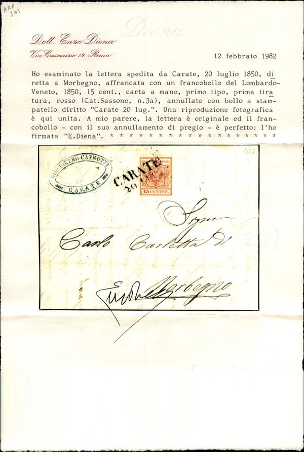 Carate (P.ti 13) - 15 cent (3a) su lettera per Morbegno del 20.7.1850 - Raybaudi + cert. Em. Diena