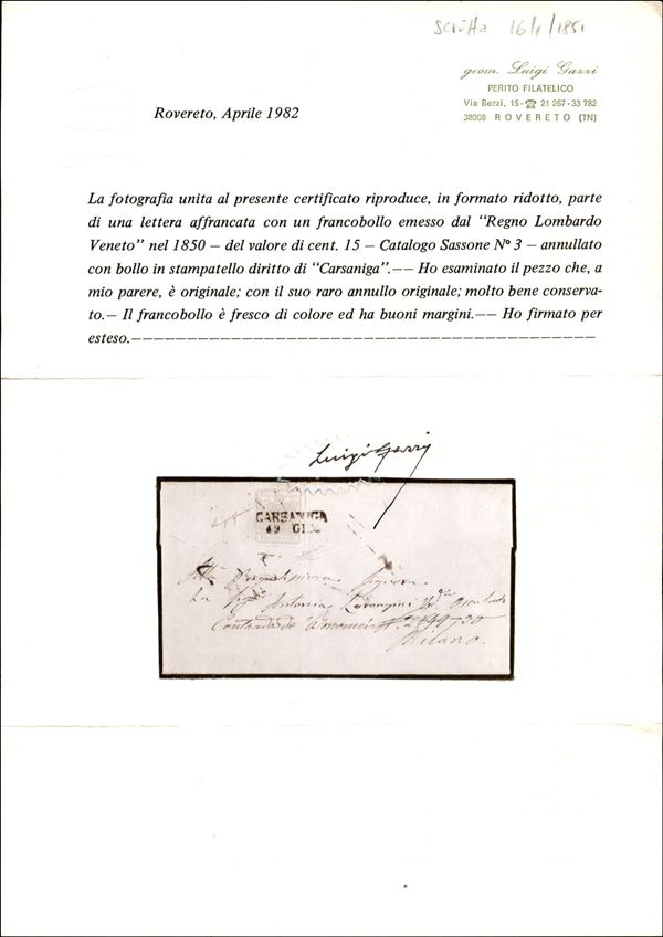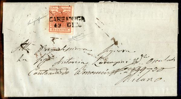 Carsaniga (P.ti 11) - 15 cent (3) su lettera per Milano del 19.1.1851 - cert. Gazzi + cert. Raybaudi