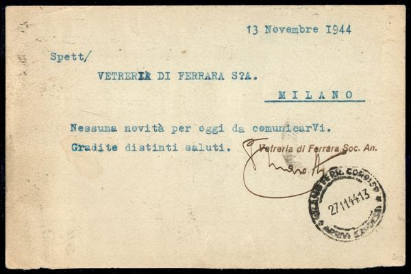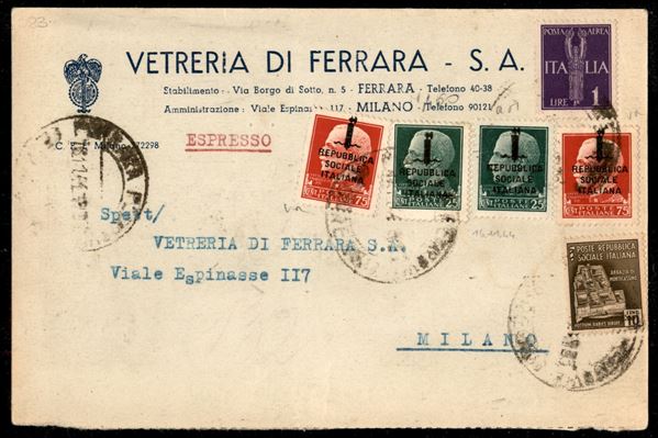 Cartolina espresso da Ferrara a Milano del 15.11.44 con affrancatura multipla mista (491 Milano + 491 Roma + due 494 Verona + 503 + Aerea 14)