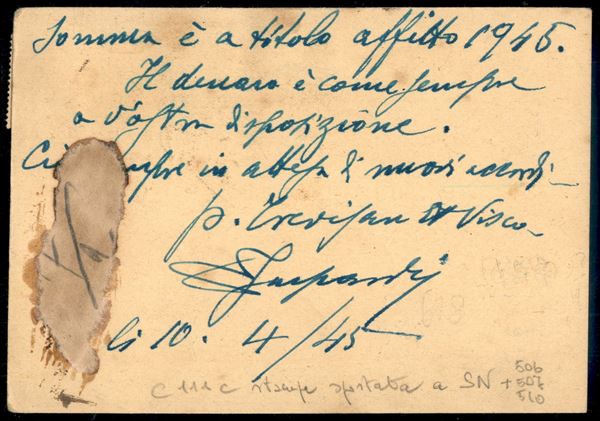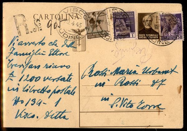 Cartolina Postale 30 cent (C111) con taglio spostato a destra e in basso - raccomandata da Visco a S. Vito a Torre del 10.4.45
