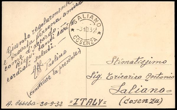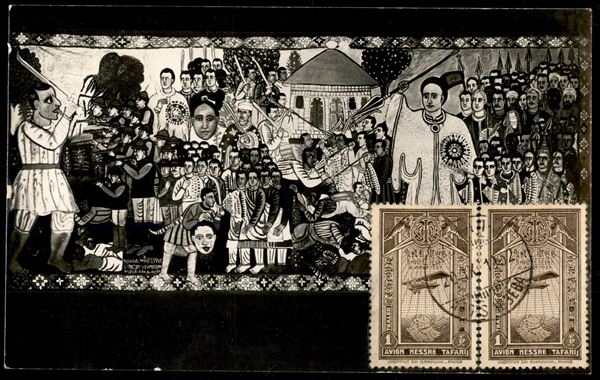 Coppia del 1 thaler (173) - cartolina da Addis Abeba a Cosenza del 20.9.32