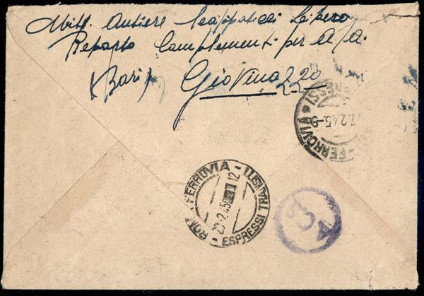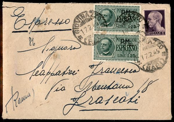 Coppia del 1,25 lire Espresso PM (20) + complementare (519) su busta da Giovinazzo a Frascati del 17.2.45