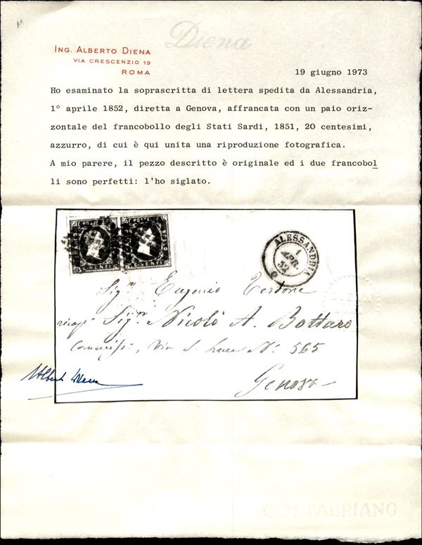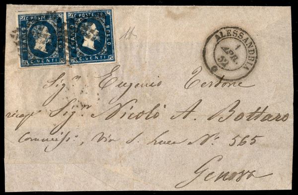 Coppia del 20 cent (2) su intero frontespizio di lettera da Alessandria a Genova del 1.4.1852 - cert. A. Diena